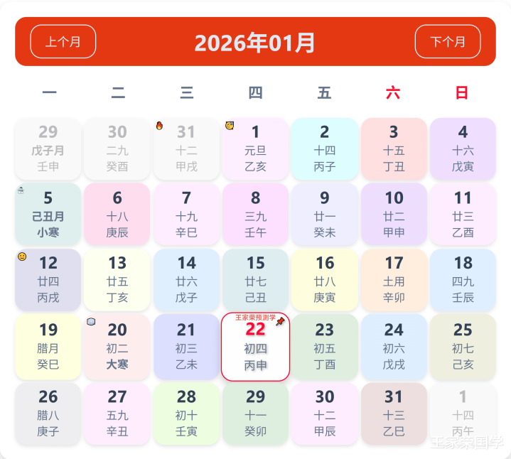 公历日历:2026年1月22日 星期四 ♒水瓶座农历日历:二〇二五年腊月初四 ♃木曜日干支编年:乙巳年 🌷木蛇🐍 纳音:覆灯火干支纪月:己丑月 🏠土牛🐮 纳音:轰隆火干支纪日:丙申日 🔥火猴🐵 纳音:山下火挂念节日: