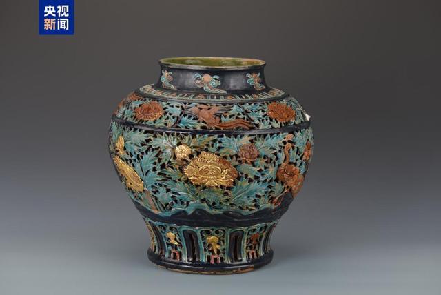 珐华贴金镂空孔雀牡丹纹大罐