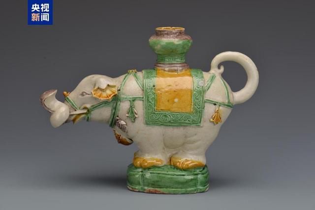 器身合座为象形,象鼻卷曲上扬为流,象尾卷曲为柄,背披鞍垫,其上托宝瓶形壶口,缰绳于背部捆绑,结为花形,缰绳上挂多处隐私,象颈挂圆形铃铛,四足并拢直立。