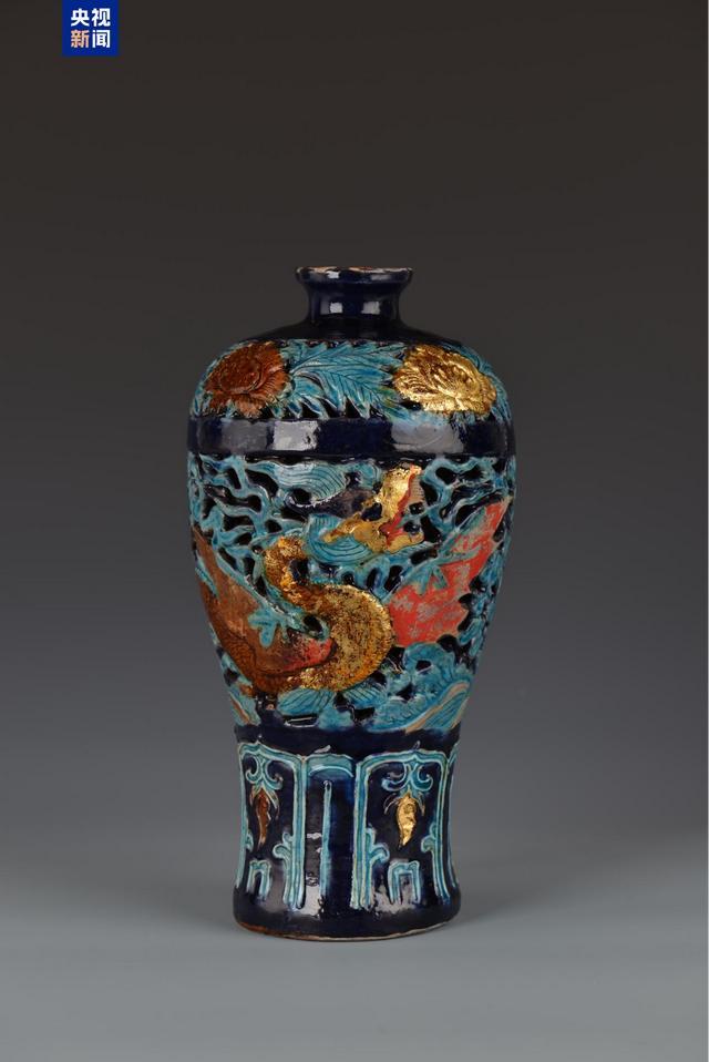 珐华贴金镂空应龙云海纹梅瓶