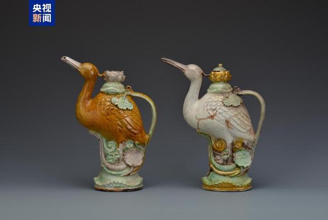 器身合座为鹭形,抬头矗立呈鸣啼状,立于莲池之中,以鹭首为流,莲茎为柄,柄肩附一圆形系,鹭背顶有一莲花形壶口,平底。灰白胎,较良好,胎体镇静。鹭身施黄釉,莲花、花苞施紫釉,两朵如意云纹分辩施黄釉和紫釉,荷叶施绿釉,外底无釉。