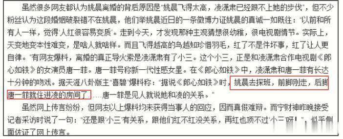 那时两边粉丝撕得昏天背地,姚晨粉丝叱咤凌潇肃出轨唐一菲,因为凌潇肃和唐一菲在2010年《郎心如铁》因戏生情,两东谈主在剧中有着长达10分钟的吻戏。有博主爆料,姚晨去探班,前脚刚走,后脚唐一菲就住进了凌潇肃的房间。